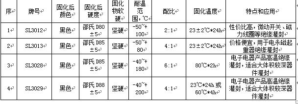 上表中的SL3029黑色灌封膠的耐溫短時(shí)間,可以到200度長(zhǎng)期,短時(shí)間能耐溫到250度,而且可以常溫或中溫固化,這在灌封膠中不多見,很有特色。