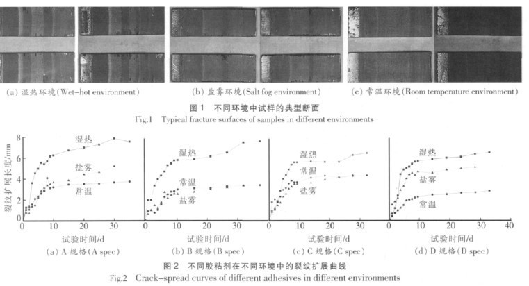 依次為 D>A>B>C; 常溫環(huán)境中,種規(guī)格膠粘劑的裂紋擴(kuò)展由快到慢依次為 C>A>B>D 鹽霧環(huán)境中,種規(guī)格膠粘劑的裂紋擴(kuò)展由快到慢依次為 D>A>C>B。