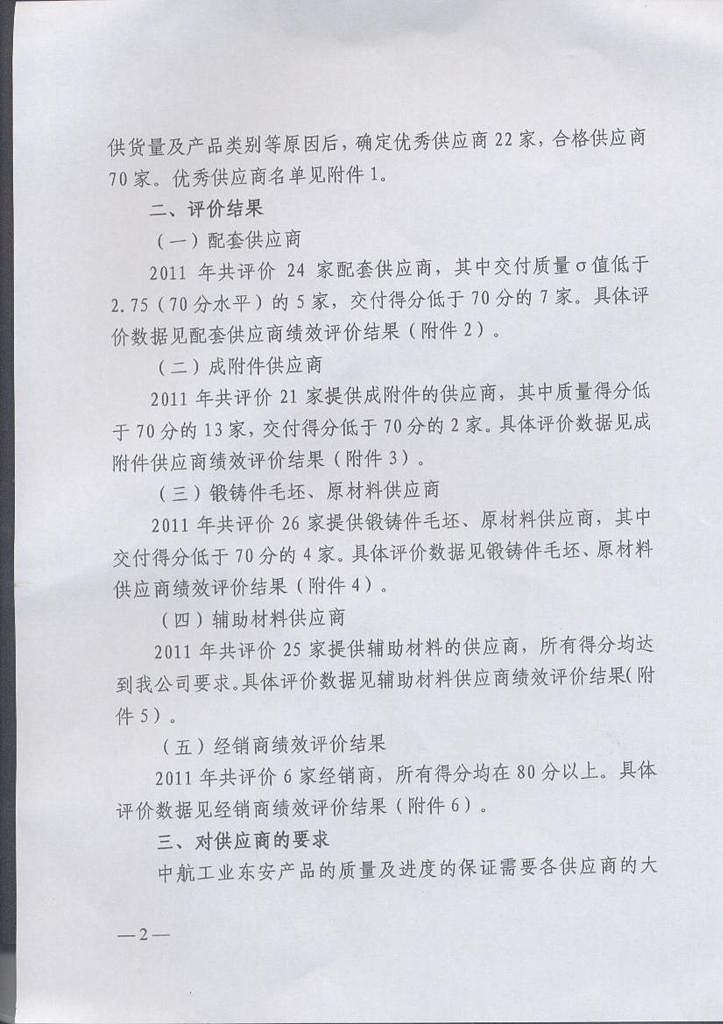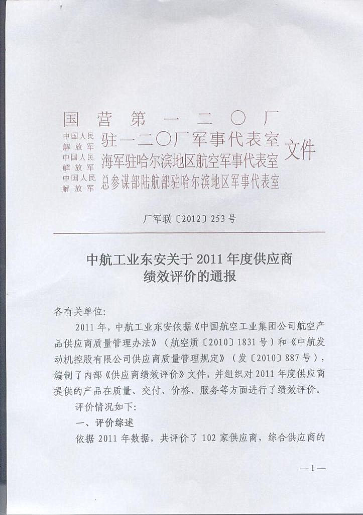 因高溫密封膠產品榮獲國營二0廠(中航工業(yè)東安發(fā)動機集團公司)2011年度優(yōu)秀供應商稱號