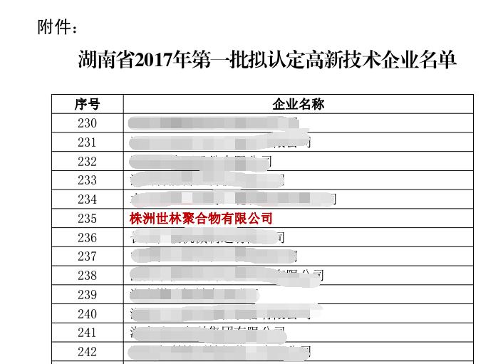 祝賀世林膠業(yè)成為湖南省2017年批擬認(rèn)定高新技術(shù)企業(yè)