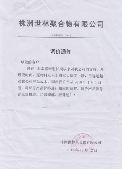 您現在的位置:世林膠業(yè)首頁 - 資訊大全 - 世林膠業(yè)2018年1月調價通知
